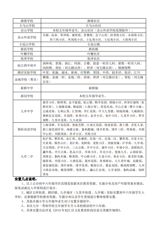 2.城区五所街道、泗泾镇、九亭地区(九里亭街道、九亭镇)实际安置初中六年级学生入学时,还要根据学校教育资源、生源分布以及学生类别进行整体统筹安置。