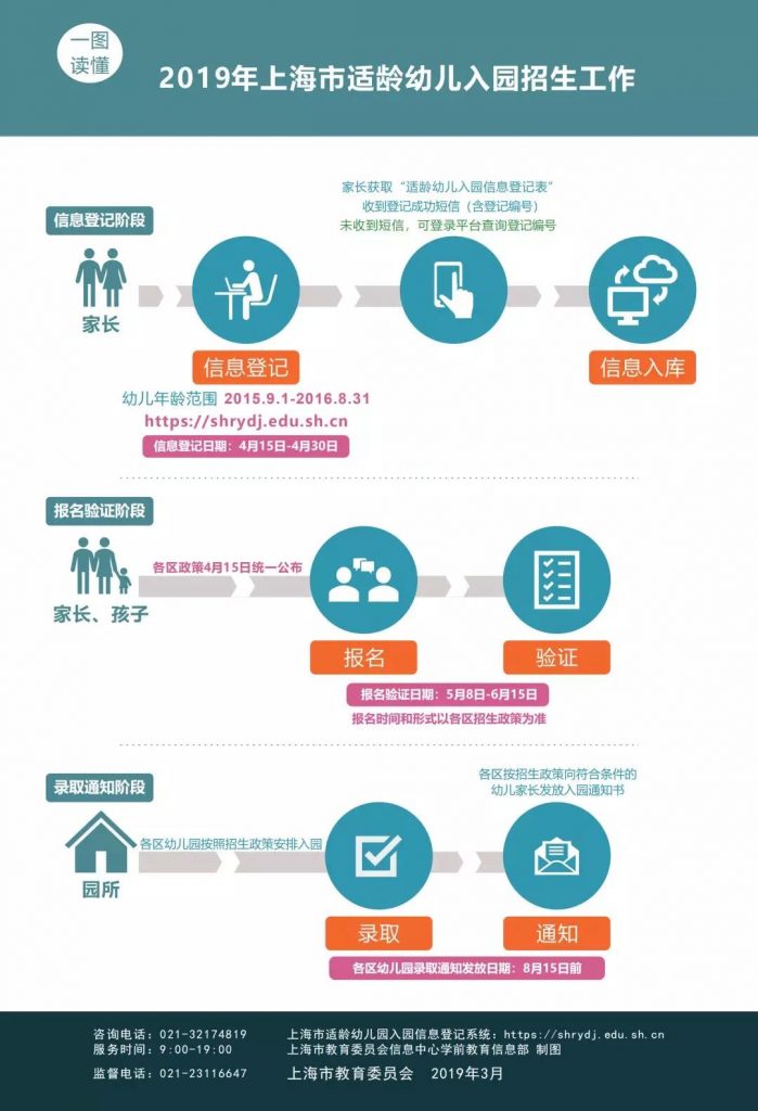 上海市教委近日公布《2019年本市学前教育阶段适龄幼儿入园工作的通知》(简称“通知”)。凡拟报名入本市幼儿园小班的幼儿家长须于4月15日—4月30日通过“上海市适龄幼儿入园信息登记系统”(https://shrydj.edu.sh.cn)进行网上信息登记。这是本市首次启用统一的全市适龄幼儿入园信息登记系统,为适龄幼儿入园提供政策查询、信息登记等服务。