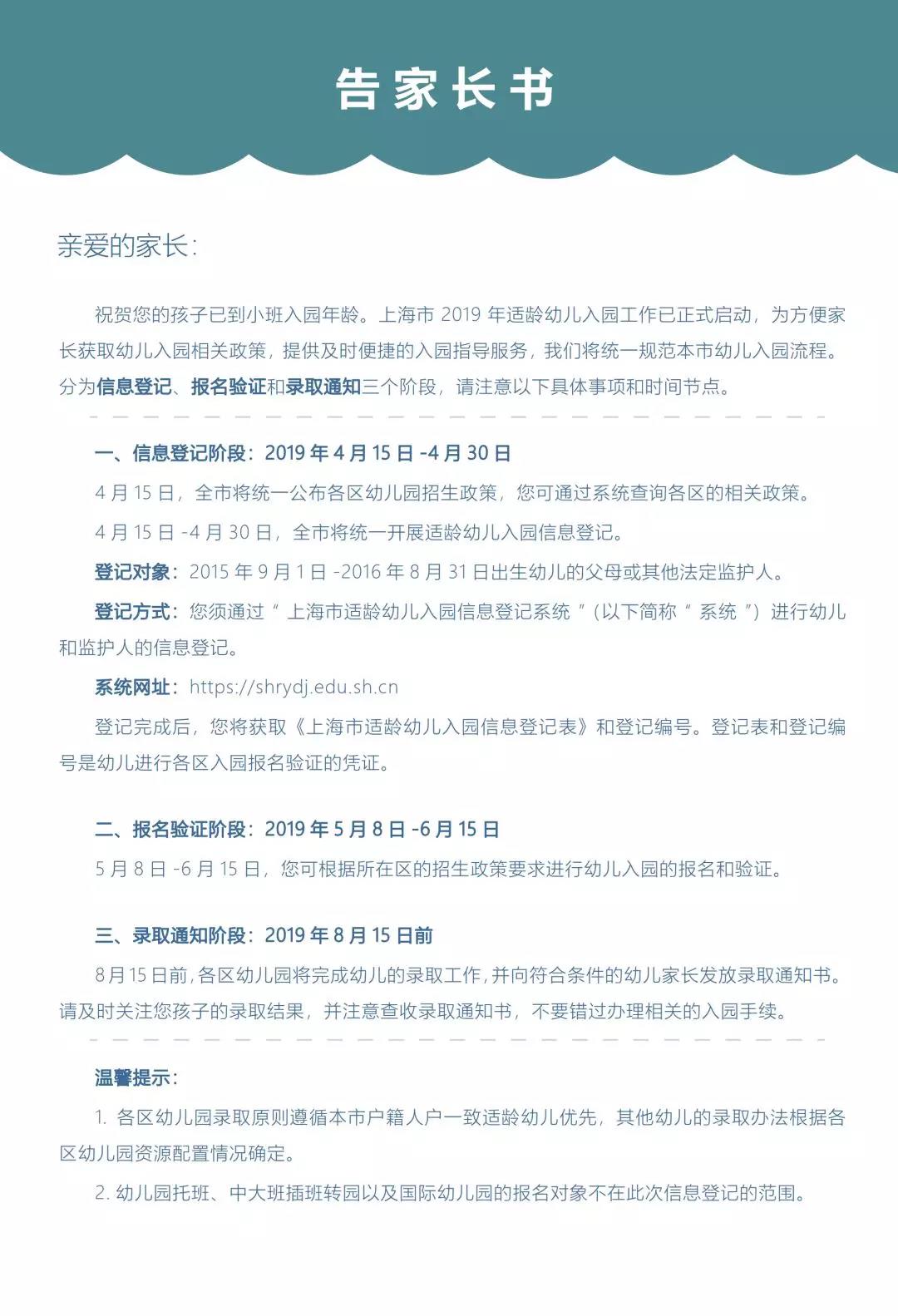 4月15日,各区公布幼儿园招生政策,“上海市适龄幼儿入园信息登记系统”开放。家长可通过该系统及时了解招生政策,注册后进行信息登记。4月30日网上信息登记结束。