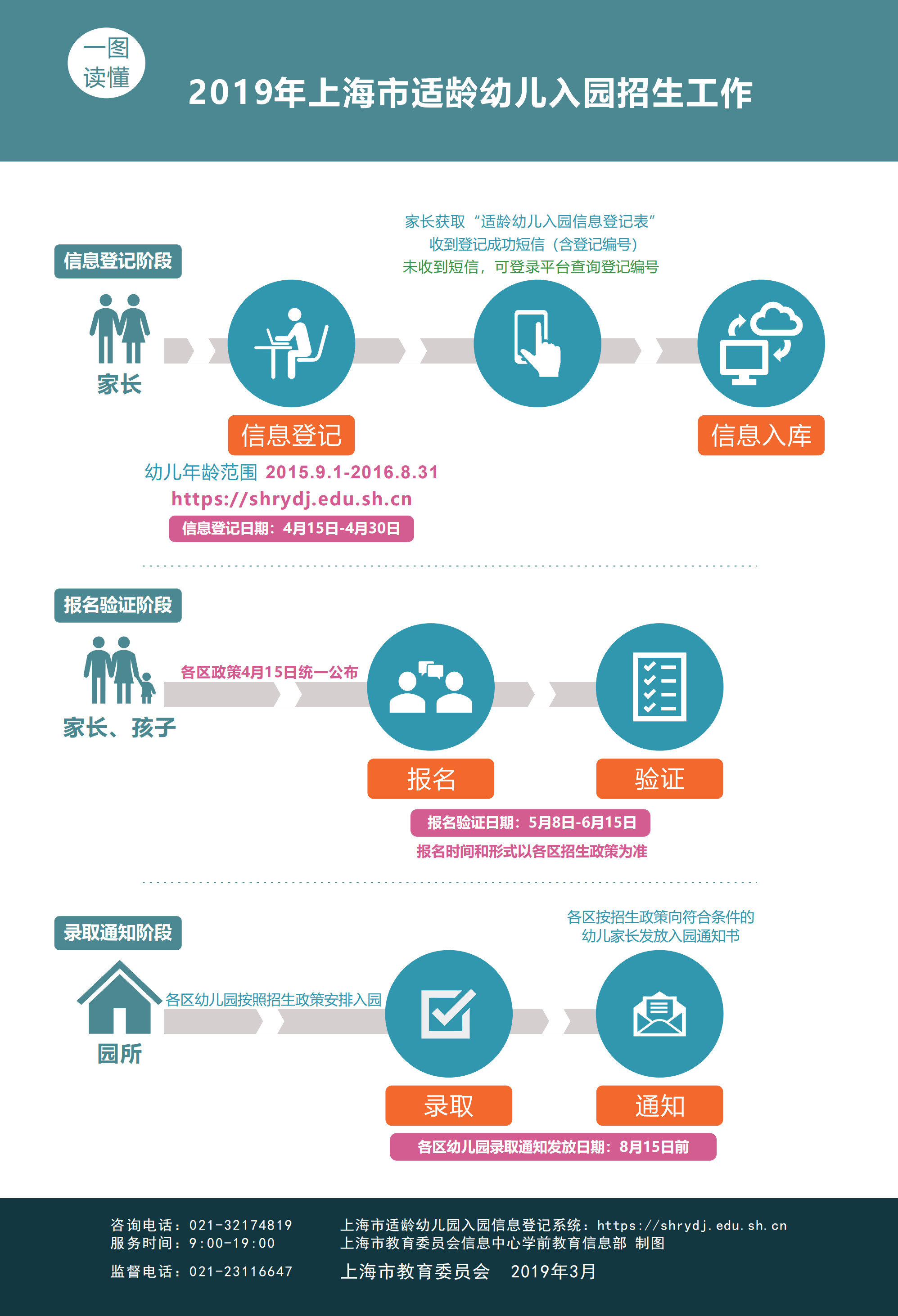 上海市适龄幼儿入园工作主要分为信息登记、报名验证和录取通知三个阶段。