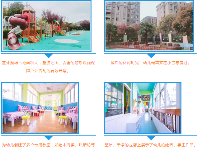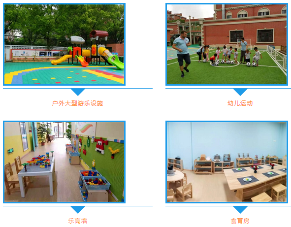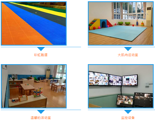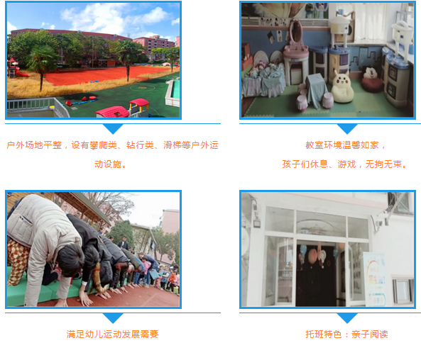 硬件设施:托育班每间教室128㎡,均配有独立的教室、午睡室、盥洗室及消毒间。教室皆是软包设计并提供符合年龄段的配套玩具与活动材料。室外活动场地占地1200㎡,设有大小型攀爬设备、沙池、游戏乐园等户外设施。地面铺设有塑胶场地及天然草坪,让孩子在嬉戏的过程中健康快乐成长。